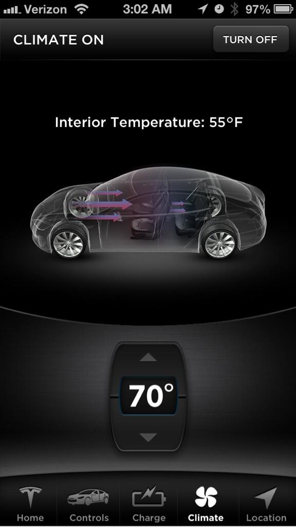 At 3:30 AM Saturday, I left the Boston areapreheat.  I pre-heated the car using the iPhone app (left).  Pretty useful that I can set the temperature and then check to see if the temperature has been reached.  The first leg to CT was only 140 miles and 46F — no problem for the Model S.  I’d been to the CT Supercharger a few times at this point so it was rather uneventful.  And way too early in the morning.  Fortunately I spent the short time charging checking on traffic as I-95 was *closed* due to a major accident.  Fortunately I rerouted and lost maybe 30 minutes of time.  I arrived in Delaware – 183 miles away – and was charging by 9:40 AM.  I had about 26 miles of range left.  16 minutes later I had 105 miles of range!
